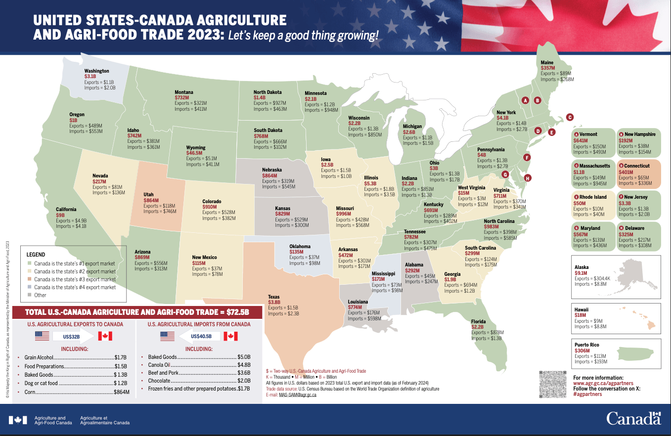 Canada and the United States (U.S.) share one of the most significant agricultural trading relationships in the world. Over half of Canada’s agri-food imports originate in the U.S., while 60% of Canada’s agri-food exports head south. Any disruption—like new tariffs—will directly impact farmers, food businesses, and consumers on both sides of the border.